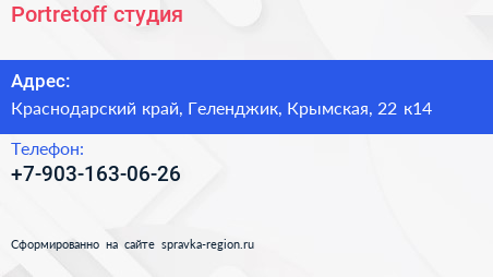 Portretoff, студия по адресу Краснодарский край, Геленджик, Крымская, 22 к14 в дальнейшем Организация, размещена в следующих категориях: