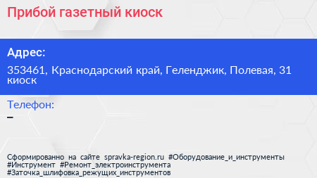 Прибой, газетный киоск по адресу 353461, Краснодарский край, Геленджик, Полевая, 31 киоск в дальнейшем Организация, размещена в следующих категориях: