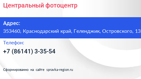 Центральный, фотоцентр по адресу 353460, Краснодарский край, Геленджик, Островского, 13 в дальнейшем Организация, размещена в следующих категориях: