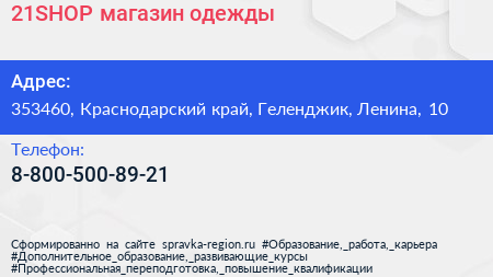 21SHOP, магазин одежды по адресу 353460, Краснодарский край, Геленджик, Ленина, 10 в дальнейшем Организация, размещена в следующих категориях: