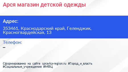 Арся, магазин детской одежды по адресу 353461, Краснодарский край, Геленджик, Красногвардейская, 13 в дальнейшем Организация, размещена в следующих категориях: