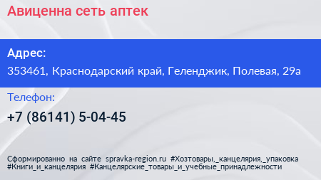 Авиценна, сеть аптек по адресу 353461, Краснодарский край, Геленджик, Полевая, 29а в дальнейшем Организация, размещена в следующих категориях: