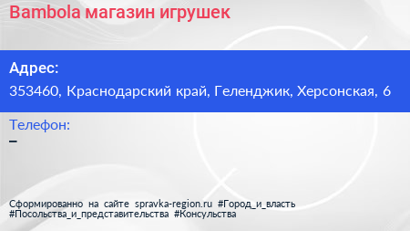 Bambola, магазин игрушек по адресу 353460, Краснодарский край, Геленджик, Херсонская, 6 в дальнейшем Организация, размещена в следующих категориях: