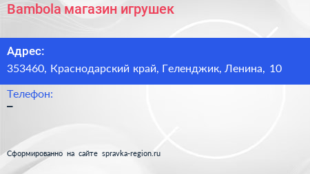 Bambola, магазин игрушек по адресу 353460, Краснодарский край, Геленджик, Ленина, 10 в дальнейшем Организация, размещена в следующих категориях: