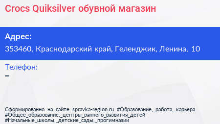 Crocs & Quiksilver, обувной магазин по адресу 353460, Краснодарский край, Геленджик, Ленина, 10 в дальнейшем Организация, размещена в следующих категориях: