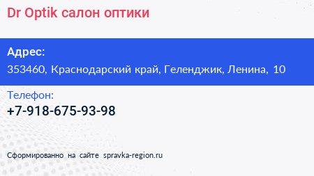 Dr.Optik, салон оптики по адресу 353460, Краснодарский край, Геленджик, Ленина, 10 в дальнейшем Организация, размещена в следующих категориях: