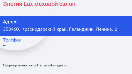 Элегия Lux, меховой салон по адресу 353460, Краснодарский край, Геленджик, Ленина, 1 в дальнейшем Организация, размещена в следующих категориях: