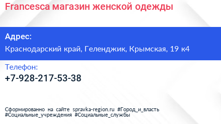 Francesca, магазин женской одежды по адресу Краснодарский край, Геленджик, Крымская, 19 к4 в дальнейшем Организация, размещена в следующих категориях:
