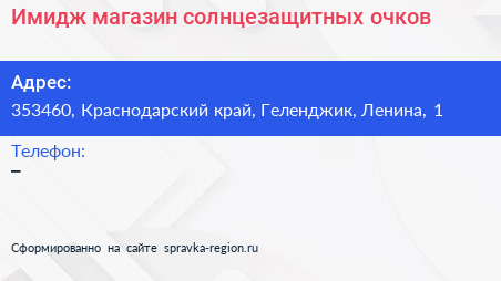 Имидж, магазин солнцезащитных очков по адресу 353460, Краснодарский край, Геленджик, Ленина, 1 в дальнейшем Организация, размещена в следующих категориях:
