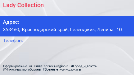 Lady Collection по адресу 353460, Краснодарский край, Геленджик, Ленина, 10 в дальнейшем Организация, размещена в следующих категориях: