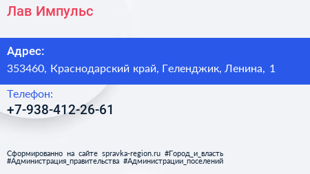 Лав Импульс по адресу 353460, Краснодарский край, Геленджик, Ленина, 1 в дальнейшем Организация, размещена в следующих категориях: