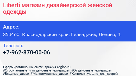 Liberti, магазин дизайнерской женской одежды по адресу 353460, Краснодарский край, Геленджик, Ленина, 1 в дальнейшем Организация, размещена в следующих категориях: