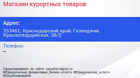 Магазин курортных товаров по адресу 353461, Краснодарский край, Геленджик, Красногвардейская, 38/2 в дальнейшем Организация, размещена в следующих категориях: