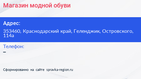 Магазин модной обуви по адресу 353460, Краснодарский край, Геленджик, Островского, 114а в дальнейшем Организация, размещена в следующих категориях:
