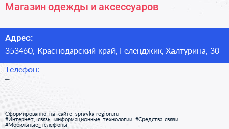 Магазин одежды и аксессуаров по адресу 353460, Краснодарский край, Геленджик, Халтурина, 30 в дальнейшем Организация, размещена в следующих категориях: