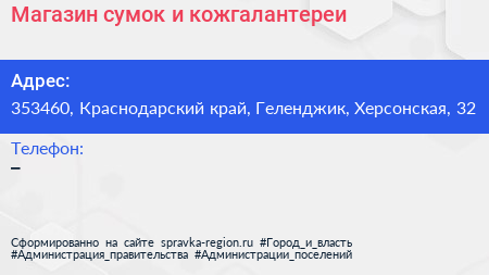 Магазин сумок и кожгалантереи по адресу 353460, Краснодарский край, Геленджик, Херсонская, 32 в дальнейшем Организация, размещена в следующих категориях: