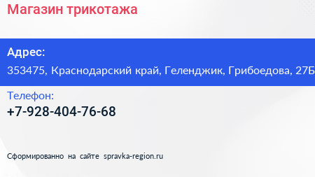 Магазин трикотажа по адресу 353475, Краснодарский край, Геленджик, Грибоедова, 27Б в дальнейшем Организация, размещена в следующих категориях: