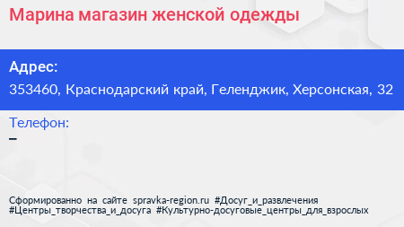 Марина, магазин женской одежды по адресу 353460, Краснодарский край, Геленджик, Херсонская, 32 в дальнейшем Организация, размещена в следующих категориях: