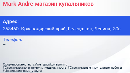 Mark & Andre, магазин купальников по адресу 353460, Краснодарский край, Геленджик, Ленина, 30в в дальнейшем Организация, размещена в следующих категориях: