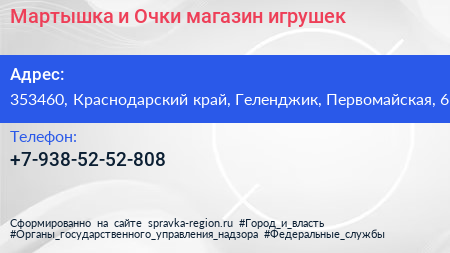 Мартышка и Очки, магазин игрушек по адресу 353460, Краснодарский край, Геленджик, Первомайская, 6 в дальнейшем Организация, размещена в следующих категориях: