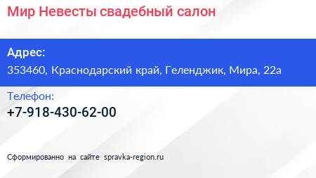 Мир Невесты, свадебный салон по адресу 353460, Краснодарский край, Геленджик, Мира, 22а в дальнейшем Организация, размещена в следующих категориях: