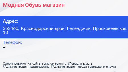 Модная Обувь, магазин по адресу 353460, Краснодарский край, Геленджик, Прасковеевская, 13 в дальнейшем Организация, размещена в следующих категориях: