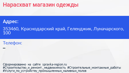 Нарасхват, магазин одежды по адресу 353460, Краснодарский край, Геленджик, Луначарского, 100 в дальнейшем Организация, размещена в следующих категориях: