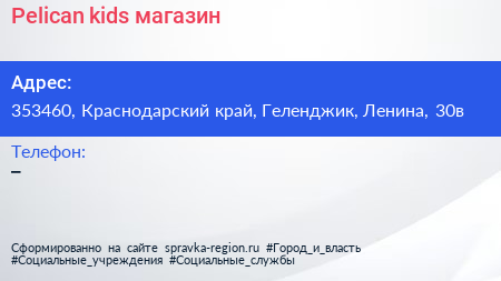 Pelican kids, магазин по адресу 353460, Краснодарский край, Геленджик, Ленина, 30в в дальнейшем Организация, размещена в следующих категориях: