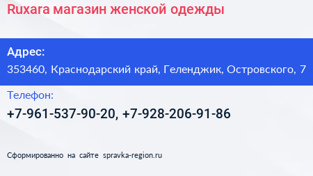 Ruxara, магазин женской одежды по адресу 353460, Краснодарский край, Геленджик, Островского, 7 в дальнейшем Организация, размещена в следующих категориях: