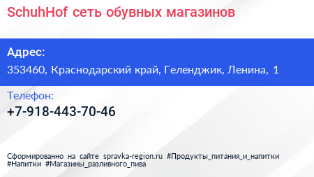 SchuhHof, сеть обувных магазинов по адресу 353460, Краснодарский край, Геленджик, Ленина, 1 в дальнейшем Организация, размещена в следующих категориях: