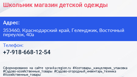 Школьник, магазин детской одежды по адресу 353460, Краснодарский край, Геленджик, Восточный переулок, 40а в дальнейшем Организация, размещена в следующих категориях:
