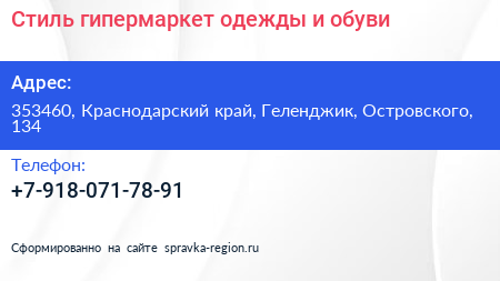 Стиль, гипермаркет одежды и обуви по адресу 353460, Краснодарский край, Геленджик, Островского, 134 в дальнейшем Организация, размещена в следующих категориях: