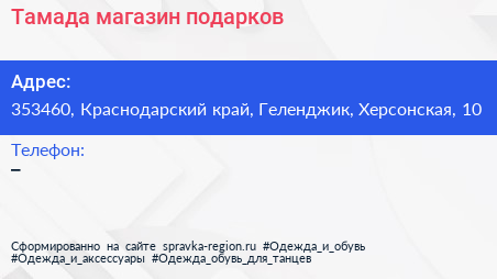 Тамада, магазин подарков по адресу 353460, Краснодарский край, Геленджик, Херсонская, 10 в дальнейшем Организация, размещена в следующих категориях: