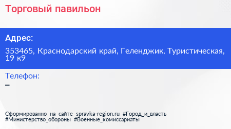 Торговый павильон по адресу 353465, Краснодарский край, Геленджик, Туристическая, 19 к9 в дальнейшем Организация, размещена в следующих категориях: