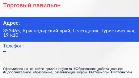 Торговый павильон по адресу 353465, Краснодарский край, Геленджик, Туристическая, 19 к10 в дальнейшем Организация, размещена в следующих категориях: