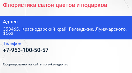 Флористика, салон цветов и подарков по адресу 353465, Краснодарский край, Геленджик, Луначарского, 166а в дальнейшем Организация, размещена в следующих категориях: