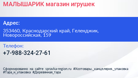 МАЛЫШАРИК, магазин игрушек по адресу 353460, Краснодарский край, Геленджик, Новороссийская, 159 в дальнейшем Организация, размещена в следующих категориях: