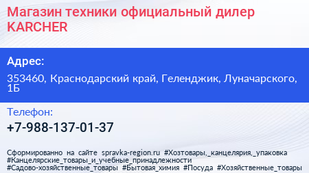 Магазин техники, официальный дилер KARCHER по адресу 353460, Краснодарский край, Геленджик, Луначарского, 1Б в дальнейшем Организация, размещена в следующих категориях: