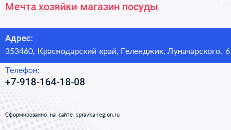 Мечта хозяйки, магазин посуды по адресу 353460, Краснодарский край, Геленджик, Луначарского, 6 в дальнейшем Организация, размещена в следующих категориях: