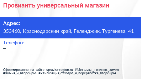 Провиантъ, универсальный магазин по адресу 353460, Краснодарский край, Геленджик, Тургенева, 41 в дальнейшем Организация, размещена в следующих категориях: