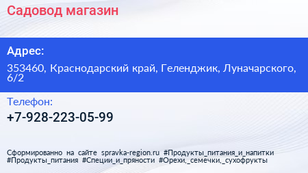 Садовод, магазин по адресу 353460, Краснодарский край, Геленджик, Луначарского, 6/2 в дальнейшем Организация, размещена в следующих категориях: