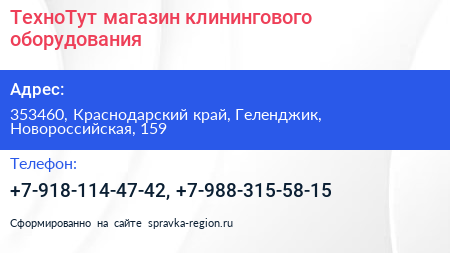 ТехноТут, магазин клинингового оборудования по адресу 353460, Краснодарский край, Геленджик, Новороссийская, 159 в дальнейшем Организация, размещена в следующих категориях:
