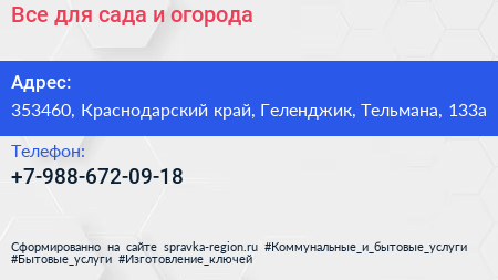 Все для сада и огорода по адресу 353460, Краснодарский край, Геленджик, Тельмана, 133а в дальнейшем Организация, размещена в следующих категориях:
