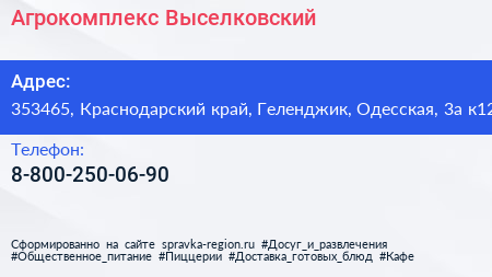 Агрокомплекс Выселковский по адресу 353465, Краснодарский край, Геленджик, Одесская, 3а к12 в дальнейшем Организация, размещена в следующих категориях: