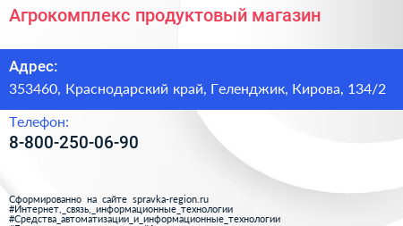 Агрокомплекс, продуктовый магазин по адресу 353460, Краснодарский край, Геленджик, Кирова, 134/2 в дальнейшем Организация, размещена в следующих категориях: