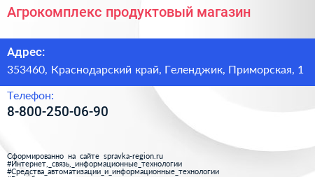 Агрокомплекс, продуктовый магазин по адресу 353460, Краснодарский край, Геленджик, Приморская, 1 в дальнейшем Организация, размещена в следующих категориях: