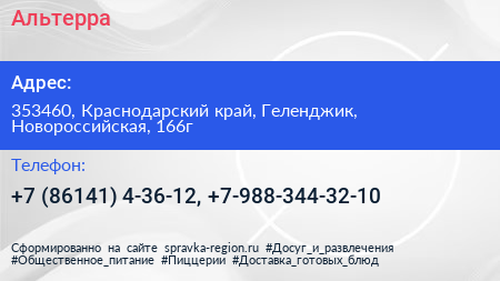Альтерра по адресу 353460, Краснодарский край, Геленджик, Новороссийская, 166г в дальнейшем Организация, размещена в следующих категориях: