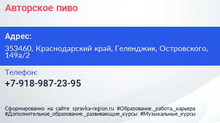 Авторское пиво по адресу 353460, Краснодарский край, Геленджик, Островского, 149а/2 в дальнейшем Организация, размещена в следующих категориях: