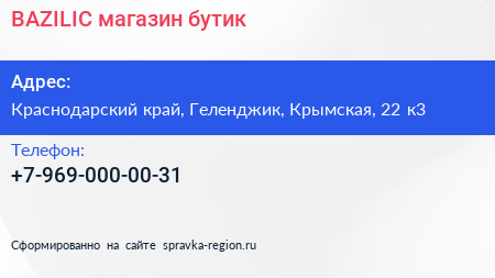 BAZILIC, магазин-бутик по адресу Краснодарский край, Геленджик, Крымская, 22 к3 в дальнейшем Организация, размещена в следующих категориях: