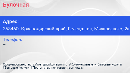 Булочная по адресу 353460, Краснодарский край, Геленджик, Маяковского, 2а в дальнейшем Организация, размещена в следующих категориях: